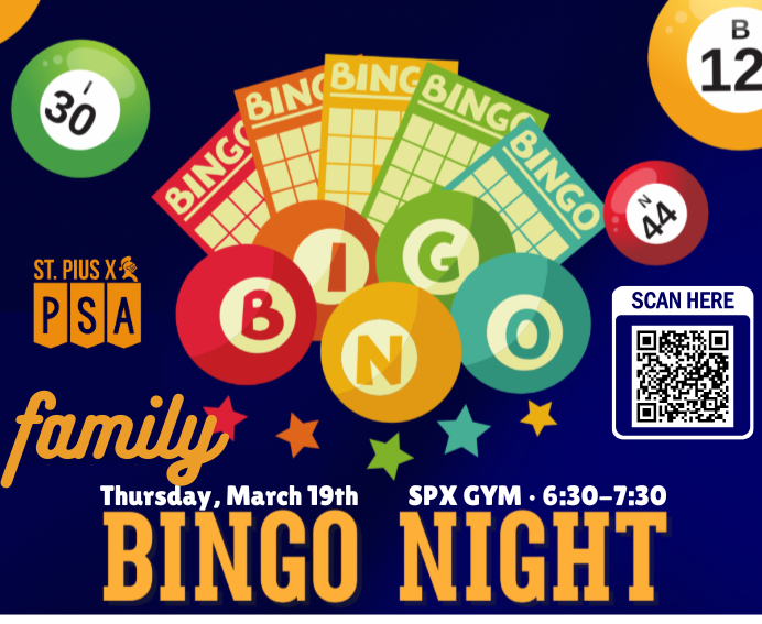 Family Bingo Night on Thursday, March 19th, in the SPX Gym—it’s always a favorite, so grab your lucky charms and join us from 6:30 to 7:30 PM.