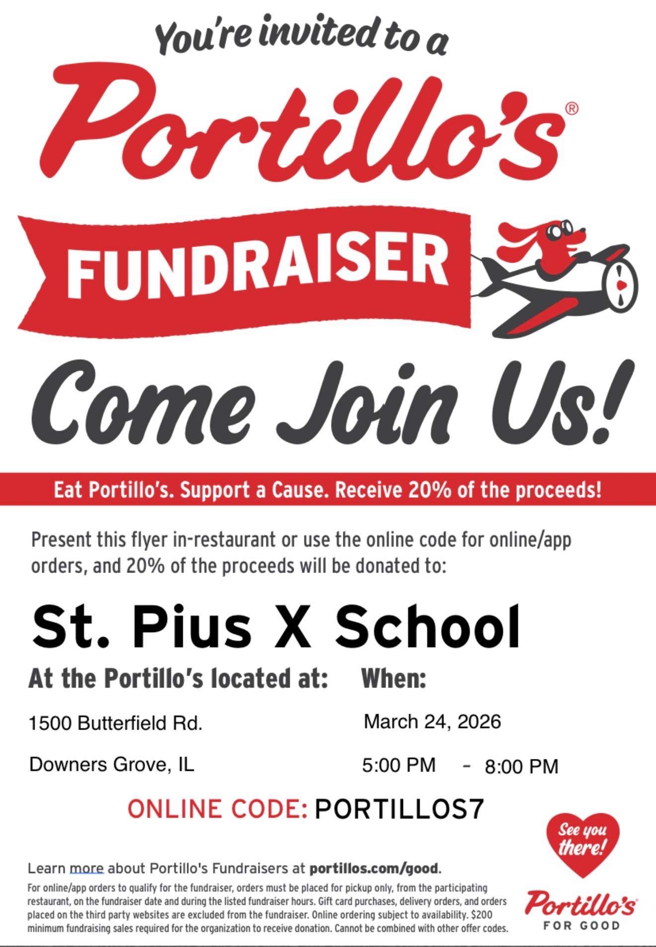 PORTILLOS7, 20% of the proceeds will go directly back to our school
